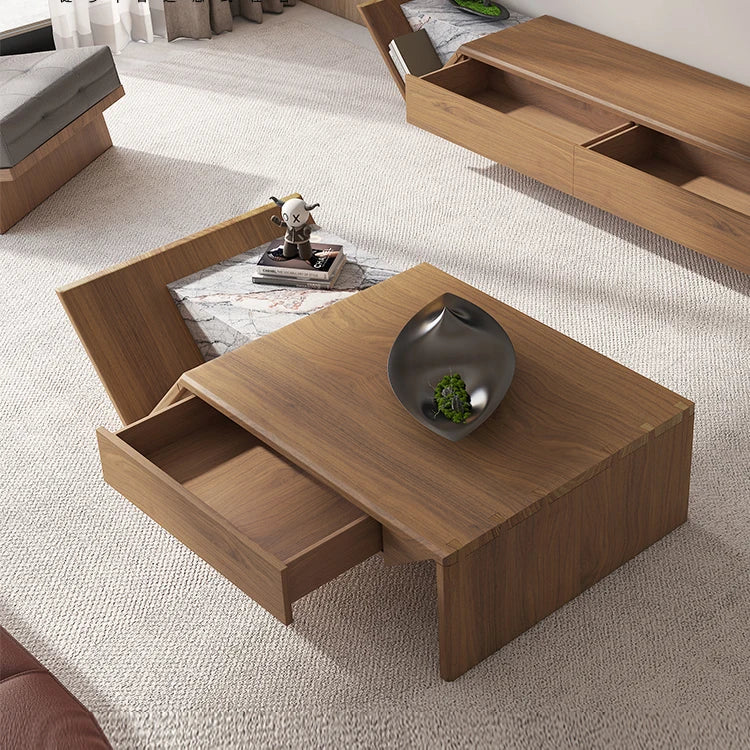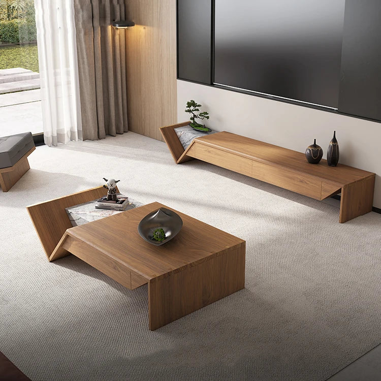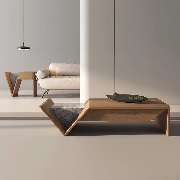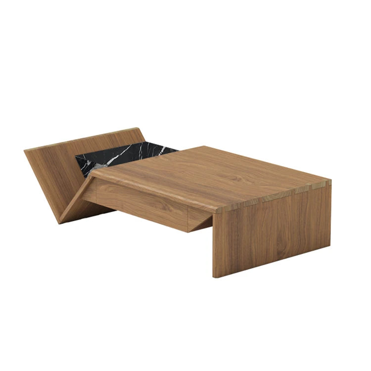 Architectural Shaped Wood Coffee Table with Premium Natural Marble Inlay
