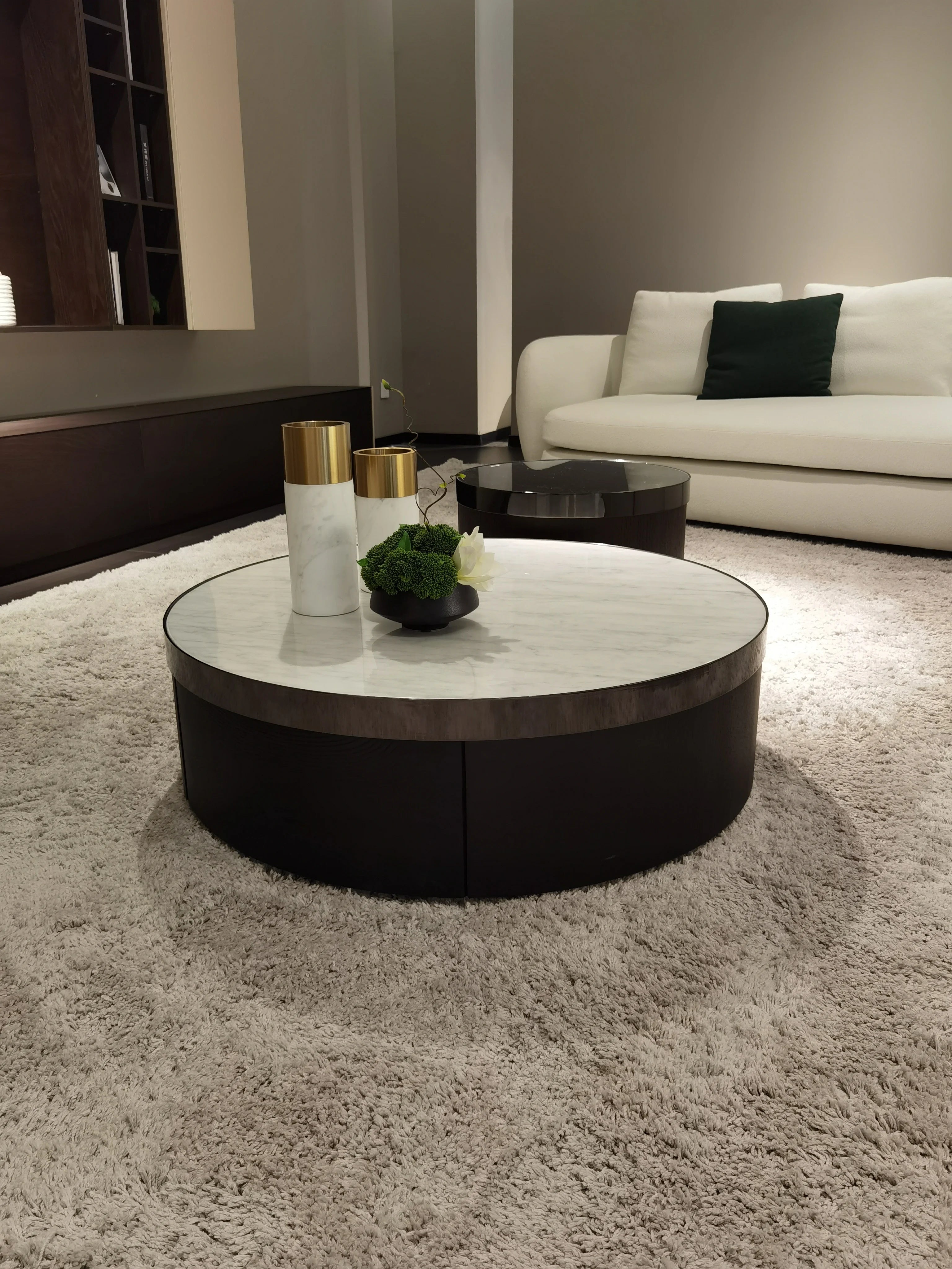 This project-grade furniture set features a sophisticated blend of natural marble and wood veneers, engineered specifically for high-end hospitality and retail environments. Designed for large-scale commercial projects, each piece demonstrates exceptional durability and precision joinery suitable for demanding retail fit-out furniture requirements. These low-profile round tables offer a versatile solution for architects and interior designers seeking scalable, high-end residential furniture or custom commercial joinery for luxury developments. The robust metal frame ensures long-term performance in high-traffic commercial environments while maintaining a premium architectural aesthetic.