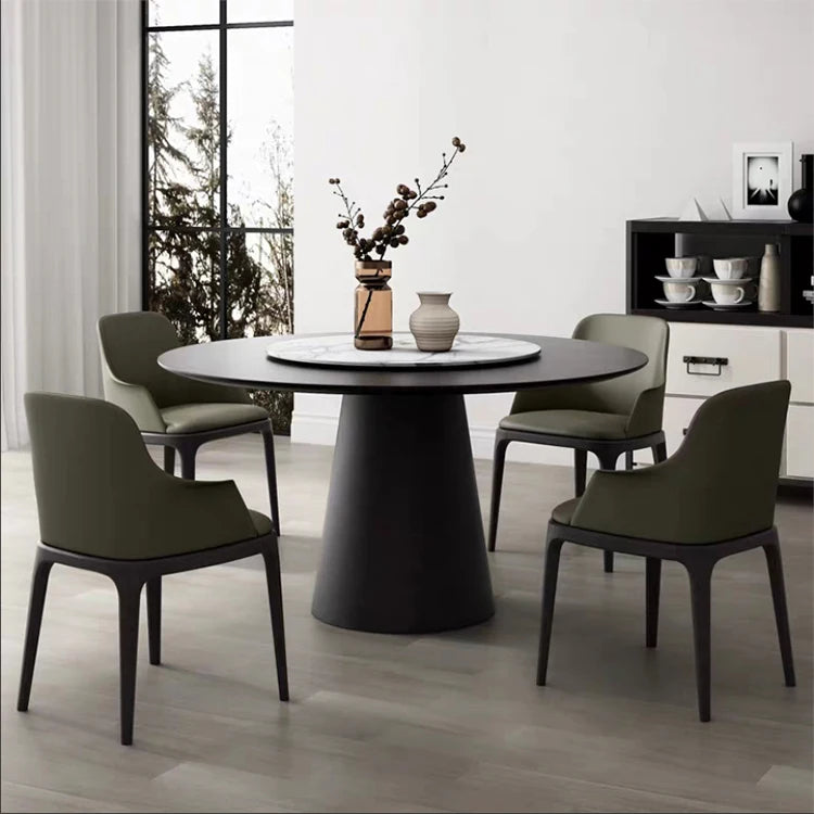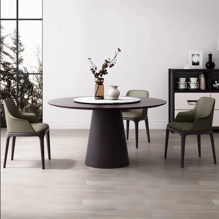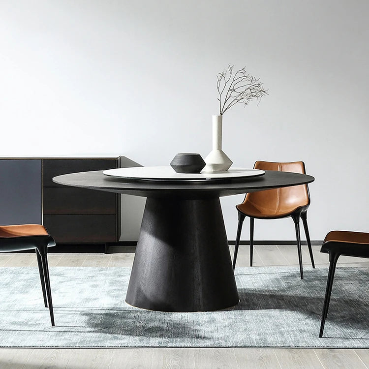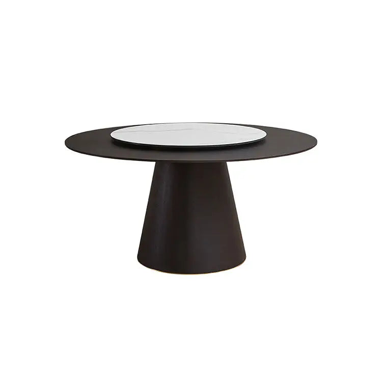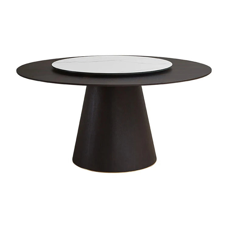 Architectural Round Marble Dining Table with Integrated Lazy Susan and Wood Base