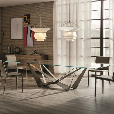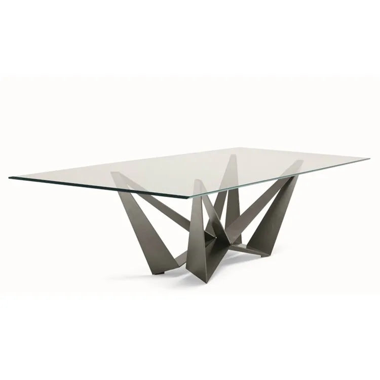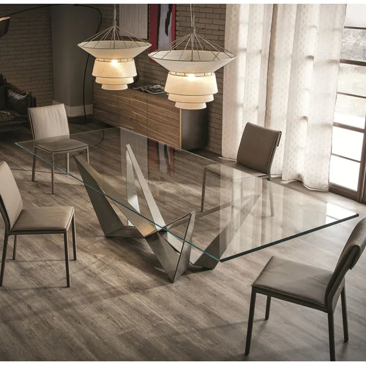 Architectural Tempered Glass Dining Table with Industrial Steel Trestle Base