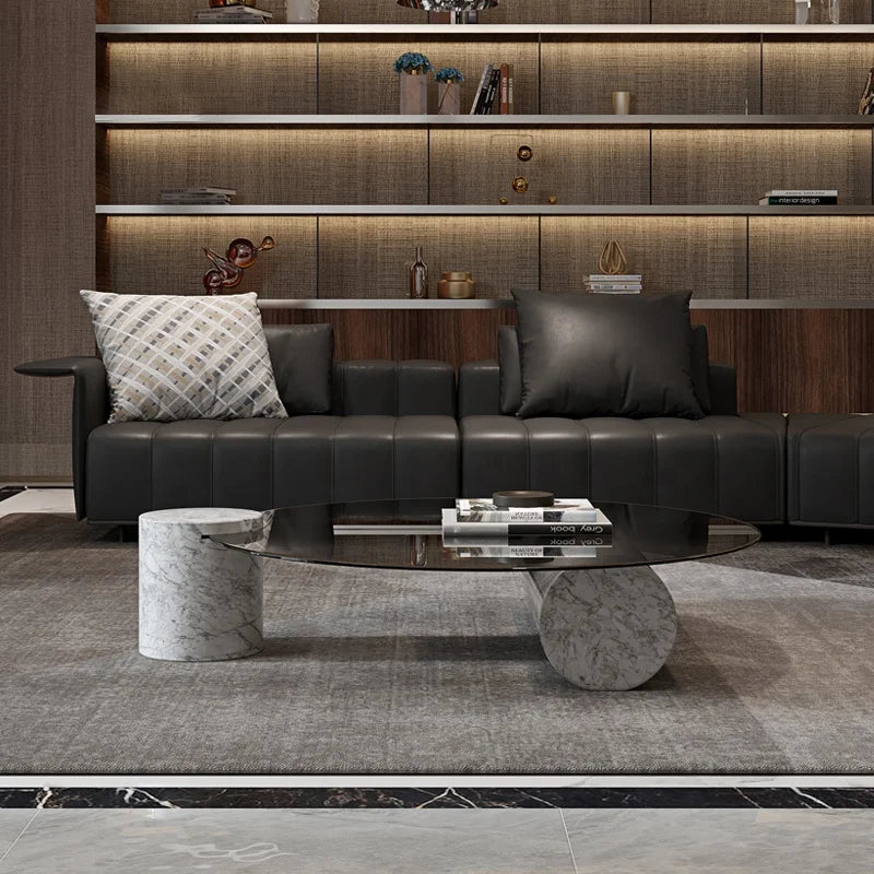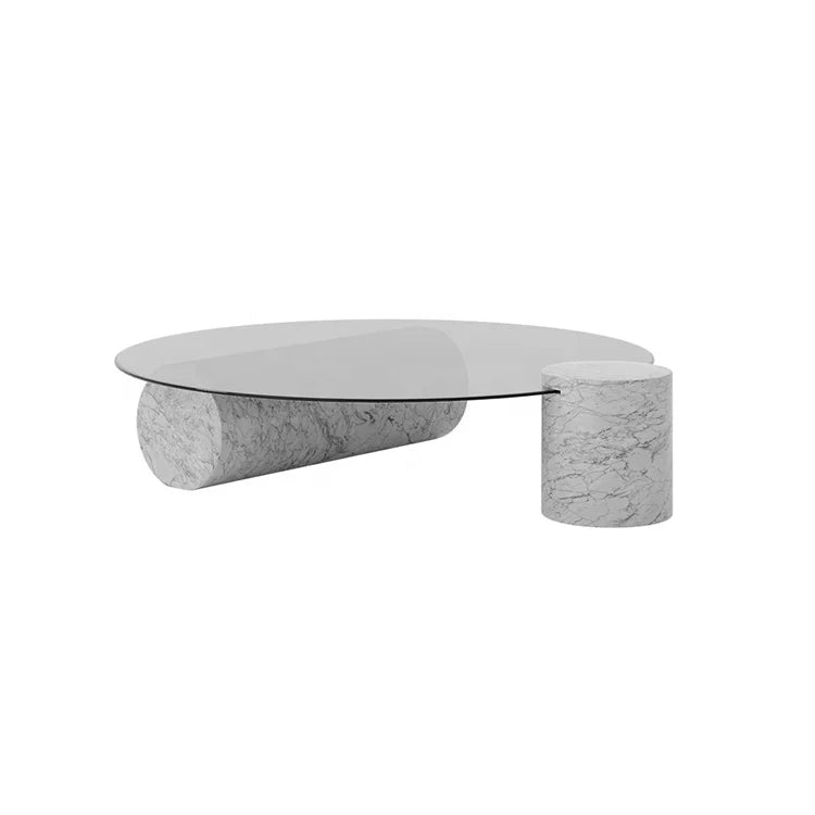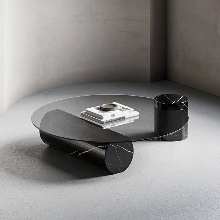 Architectural Round Glass Coffee Table with Cylindrical Marble Base