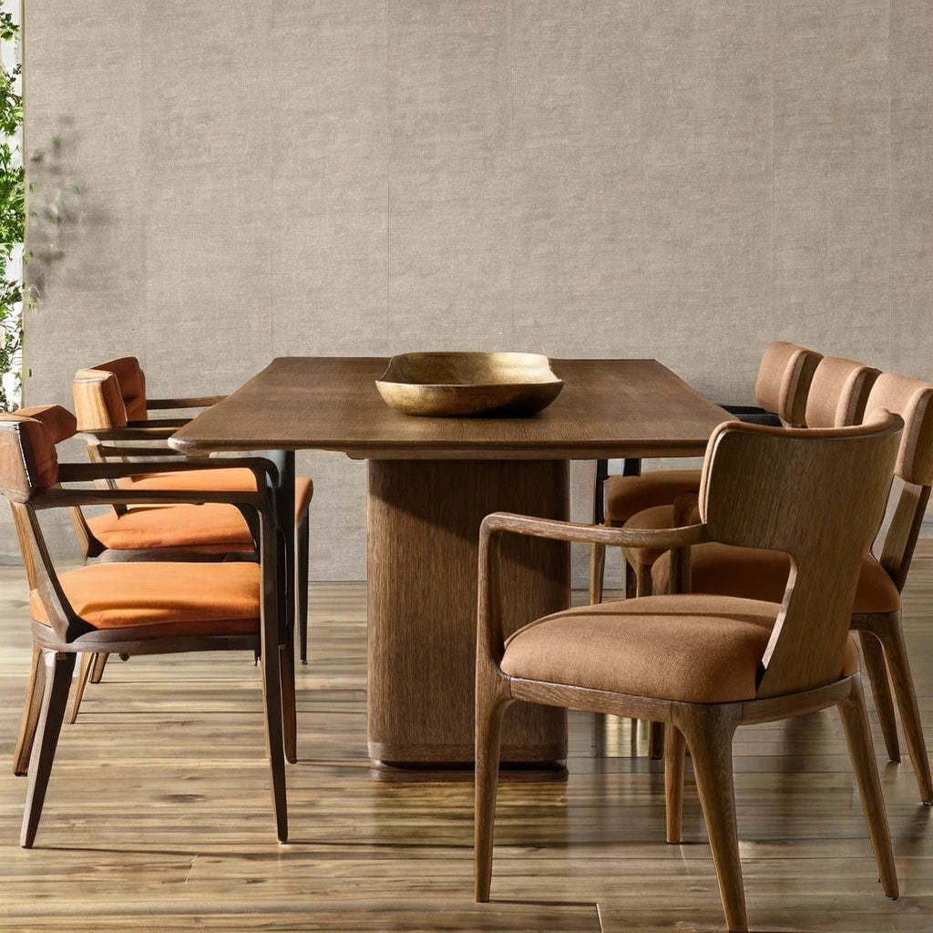 This project-grade dining table is handcrafted from solid oak and premium veneers to ensure structural longevity in high-traffic hospitality and retail environments. The multi-step high-heat finishing process involves wire brushing and staining to achieve a resilient matte surface that emphasizes the natural grain pattern. Engineered for large-scale commercial projects, the architectural trestle base features two detailed pedestal columns providing stability for luxury fit-outs and corporate environments. This custom-built solution adheres to rigorous durability standards while offering the scalability and compliance necessary for architects and interior designers managing complex commercial developments.