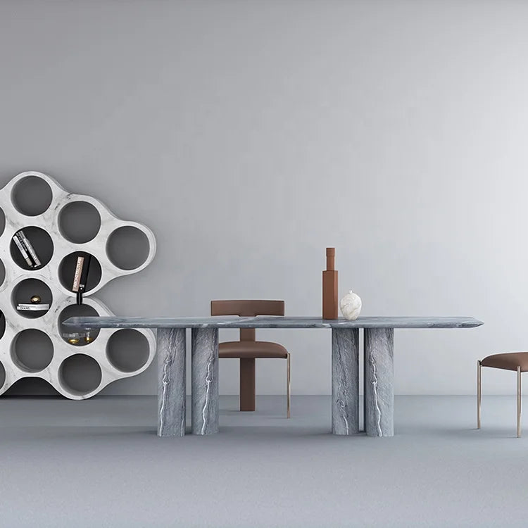 This premium natural marble dining table is engineered for high-end hospitality and retail environments, offering unparalleled durability for large-scale commercial projects. Featuring a sophisticated grey marble finish and architectural thick cylinder legs, it serves as a centerpiece for retail fit-out furniture and luxury project-grade furniture installations. The solid stone construction ensures long-term performance in demanding commercial environments while maintaining the aesthetic standards of high-end residential furniture and designer showrooms. Our custom commercial joinery capabilities allow for seamless integration into bespoke interior designs, providing architects and developers with a scalable, high-impact solution for modern fit-outs.